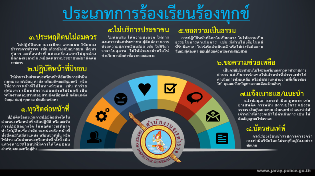6.ทางระบบร้องเรียน/ร้องทุกข์ เรื่องทุจริตและประพฤติมิชอบ สำนักงานจเรตำรวจ (เจ-คอมส์) Jcoms.police.go.th